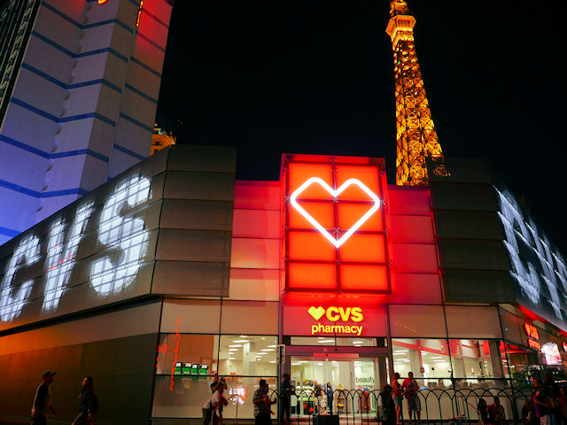 このたびストップ地区のホテル街のど真ん中ともいえるバリーズ・ホテルの前庭に、ドラッグストア CVS がオープンした。(上の写真内の右奥はパリス・ホテルのエッフェル塔の上半分、左奥の建物はバリーズ・ホテルの客室棟)