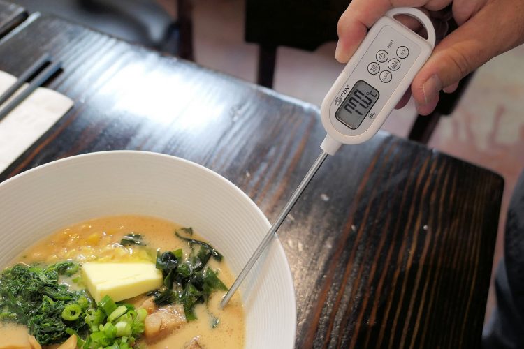 (この写真は 71.4度を示しているが、下の写真では 77.0度。この2つの写真、温度計の棒状に見えている部分の長さから、先端にあるセンサーの位置の水深が大きく異なっていることが想像できるはず。同じラーメンでもスープの水深のちがいだけで5度以上も差がある事実は知っておいて損はない。コーヒーや味噌汁では水深の差でこれほどの温度差は維持されないと思われるが、ラーメンの場合、麺そのものが高温であると同時に、麺がスープの対流を妨げているため温度差が維持されやすい)