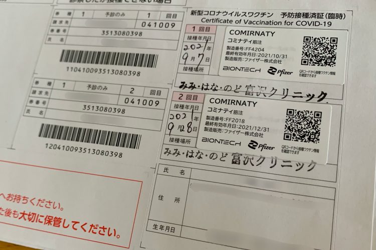 日本で発行されている最も一般的な「新型コロナワクチン接種記録書」