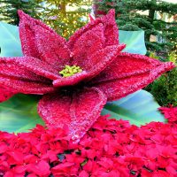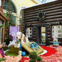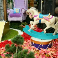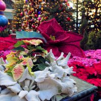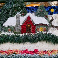 色彩的に真っ赤なポインセチアに視線を奪われがちだが、多くの展示物の表面が無数の生の花で覆われている部分も見落とさないようにしたい。