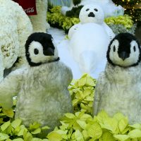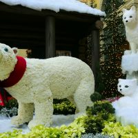今回の展示のモチーフは冬のスイスの山小屋とのことで、それらしき造形物が演出空間内に点在。その山小屋の周囲にはリボンで飾られたギフトボックスやイヌ、ウマ、クマなどのぬいぐるみが置かれ、さらに毎年登場している白クマも健在だ。そしてたっぷりのオーナメントで飾られた42フィート(約13メートル)のツリーが会場の中央を陣取る。