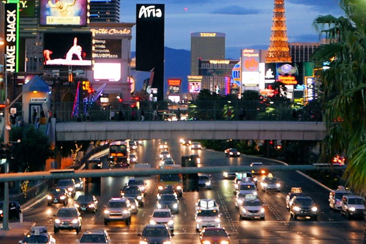 したがって宿泊料金の「週末レート」とは、金曜日の夜と土曜日の夜の宿泊料金のことであり、日曜日の夜は平日レートになる。(写真は渋滞する週末のストリップ大通り)
